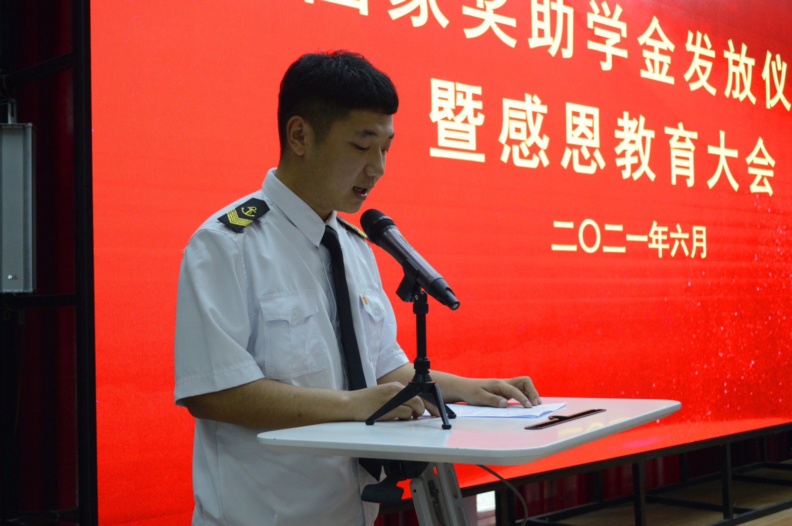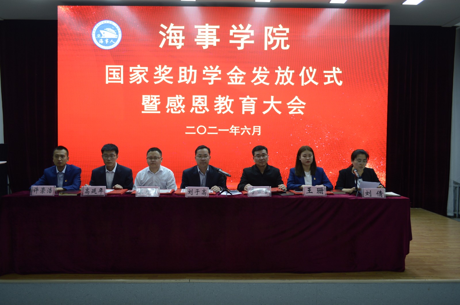 6月2日,海事学院在B5小礼堂组织召开国家奖助学金发放仪式暨感恩教育大会,海事学院党支部副书记刘子高,团总支书记宋月强,辅导员李世合、高延年、王珊、许崇浩,全体受助以及获奖学生参加会议,会议由辅导员刘倩老师主持。
