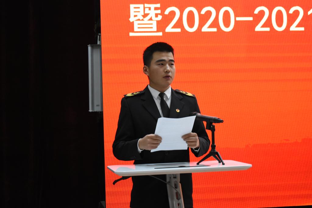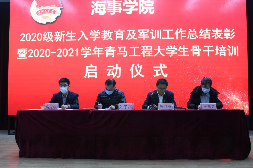 首先,高延年对2019年骨干培训和2020级新生入学教育及军训工作进行总结。其次,出席仪式的领导和老师为教官助理、辅导员助理颁发纪念品,教官助理、辅导员助理代表发言,随后,宋月强宣读《海事学院2020-2021学年青马工程大学生骨干培训方案》,2020级学生骨干代表发言。最后,刘子高对负责2020级新生入学教育及军训工作的老师、教官助理、辅导员助理表示感谢,同时从提高站位、丰富载体、搭建“青马工程”交流平台,科学规划、多措并举、建立“青马工程”长效机制,坚定信念、磨励品质、突出“青马工程”骨干实效三方面对青马工程大学生骨干培训提出要求。