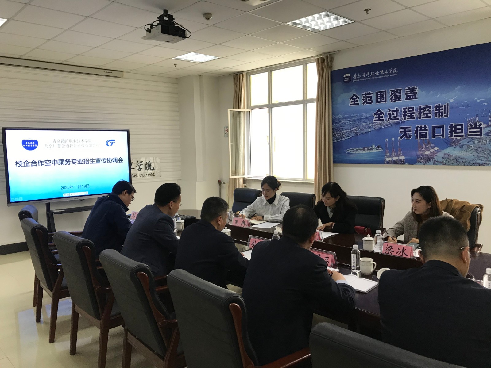 11月19日上午,校企合作空中乘务专业招生宣传协调会在A0-A718会议室举行。北京广慧金通教育科技有限公司山东区域总经理王艳霞、副总经理王冉、教师梁冰、学校招生就业办公室副主任房坤、海事学院党支部副书记刘子高,以及招就办、教务处相关老师参加了会议,会议由海事学院院长孙增华主持。