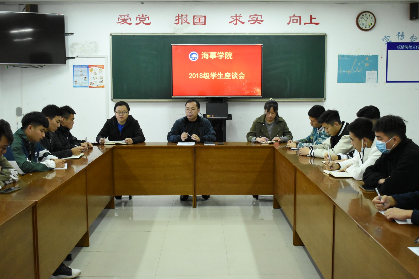 11月12日,海事学院在B1-212召开2018级学生座谈会,海事学院党支部副书记刘子高,团总支书记宋月强,辅导员王燕芳,2018级学生代表参加会议。