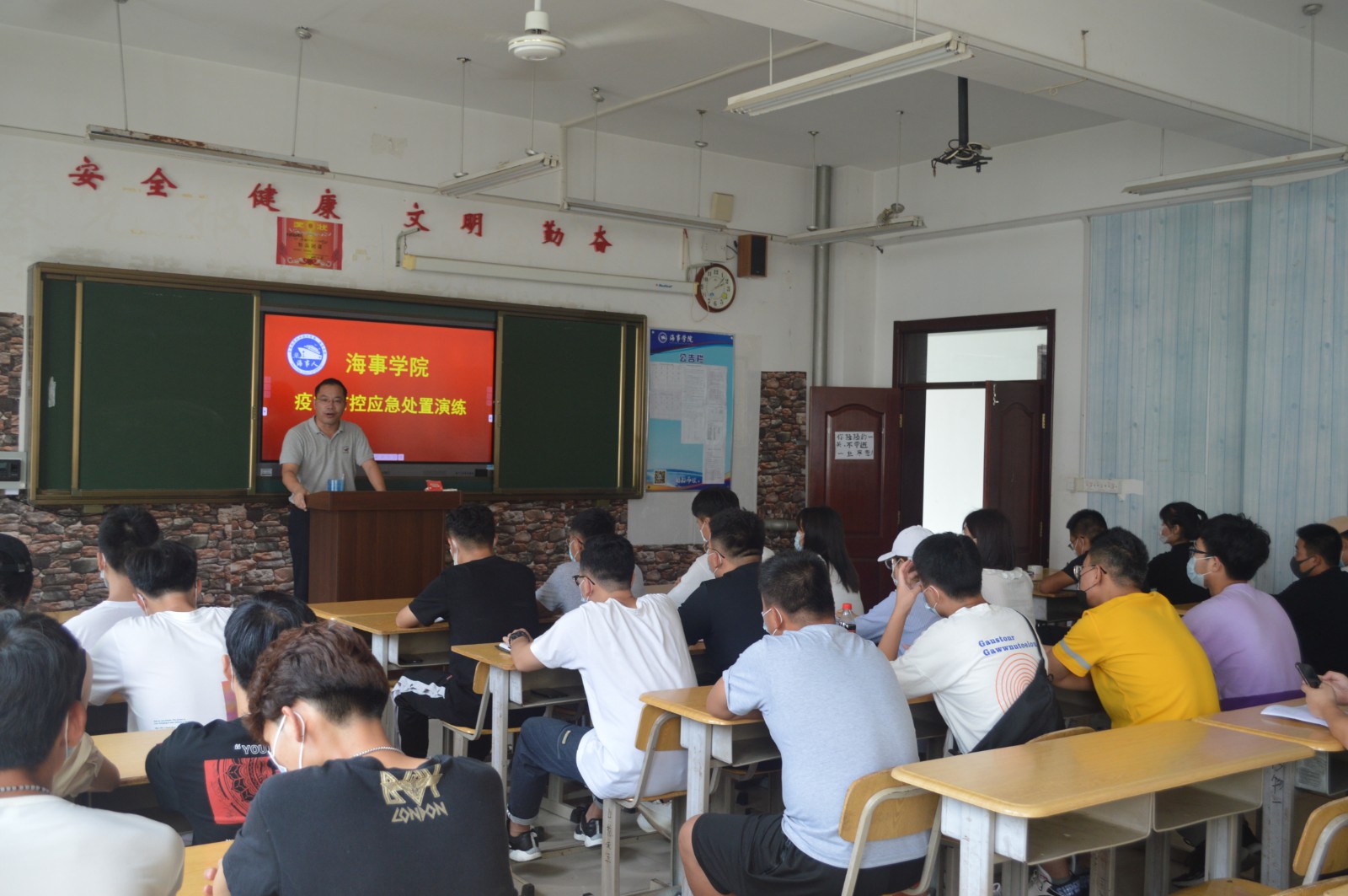 综合新闻 当前位置: 首页 >> 新闻中心 >> 综合新闻 >> 正文 海事学院组织疫情防控应急处置演练 发布日期:2020-09-07 点击: 9月6日,海事学院组织教室、餐厅、宿舍等人员场聚集性场所开展疫情防控应急处置演练,海事学院党支部副书记刘子高,全体辅导员、班主任老师,部分学生干部,各班级学生代表参加应急处置演练。 首先,高延年组织全体人员开展教室疫情防控应急处置演练。随后,全体人员有秩序地前往食堂,进行食堂疫情防控应急处置演练。最后,宋月强组织全体人员前往宿舍进行疫情防控应急处置演练。 通过此次演练,全体辅导员、班主任老师,各班级学生代表明确了疫情防控应急处置流程,为海事学院疫情防控常态化提供了保障。 图1 图2 图3 图4 上一篇:海事学院组织召开“开学第一课”主题班会 下一篇:海事学院组织召开学生工作会议