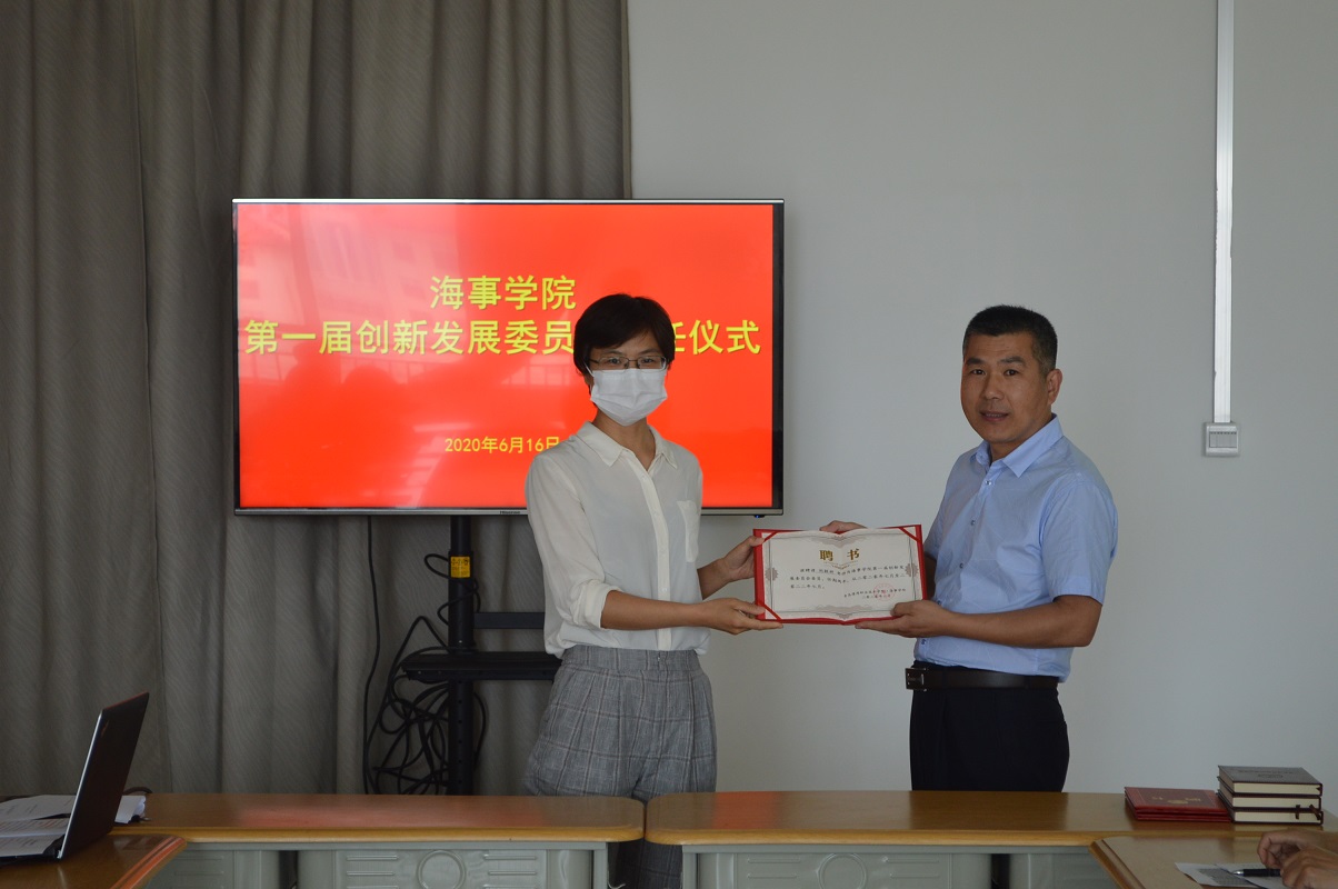 本次会议共有三项议题。首先由聂涛宣读海事学院创新发展委员会章程,并公布第一届委员会委员名单,孙增华院长为委员颁发聘书。本次创新发展委员会的成立,是海事学院努力提升办学质量,加强内涵建设和未来发展的一项重要举措,委员会委员将在提升教师教学能力、教科研立项、课程建设、专业发展、校企合作和对外交流等方面,群策群力,公正评审,科学指导,带动海事学院创新发展。