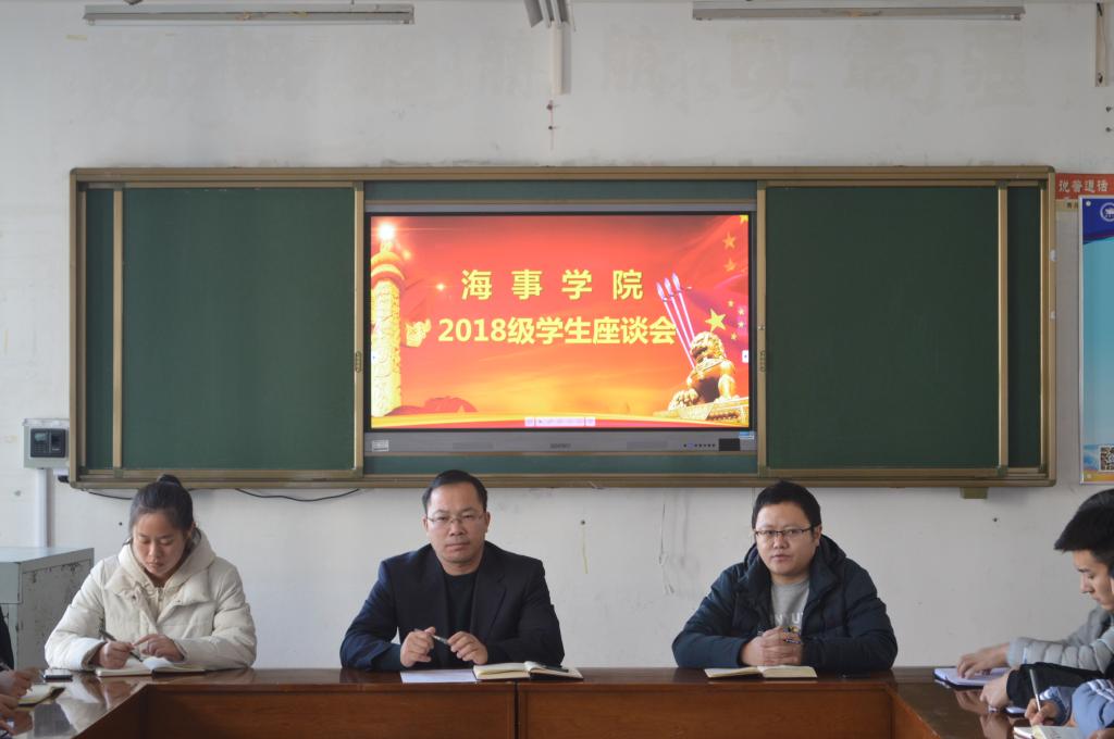 12月4日,海事学院在B1-306召开2018级学生座谈会,海事学院党支部书记刘子高,辅导员王燕芳,2018级各班学生代表参加会议,会议由海事学院团总支书记宋月强主持。