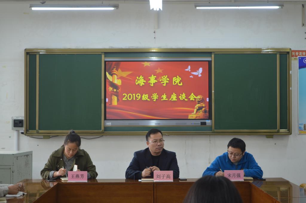 11月21日下午,海事学院在B1-306召开2019级学生座谈会,海事学院党支部书记刘子高,辅导员王燕芳,2019级各班班长、团支书参加会议,会议由海事学院团总支书记宋月强主持。