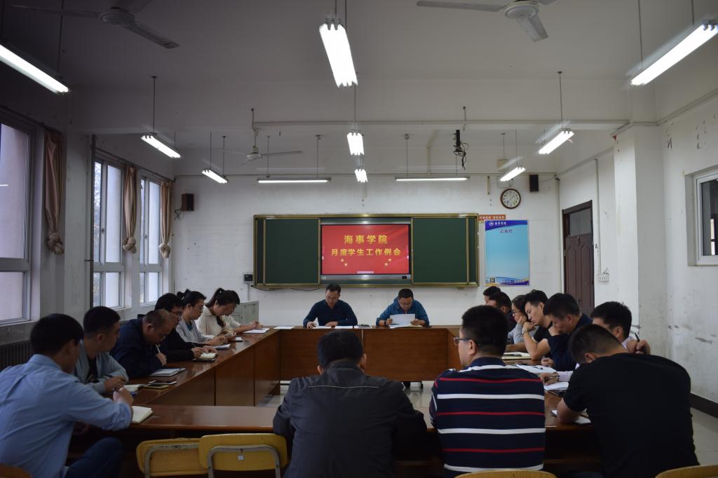 10月8日,海事学院在B1-306召开月度学生工作例会,海事学院全体辅导员、班主任老师参加会议,会议由海事学院党支部书记刘子高主持。