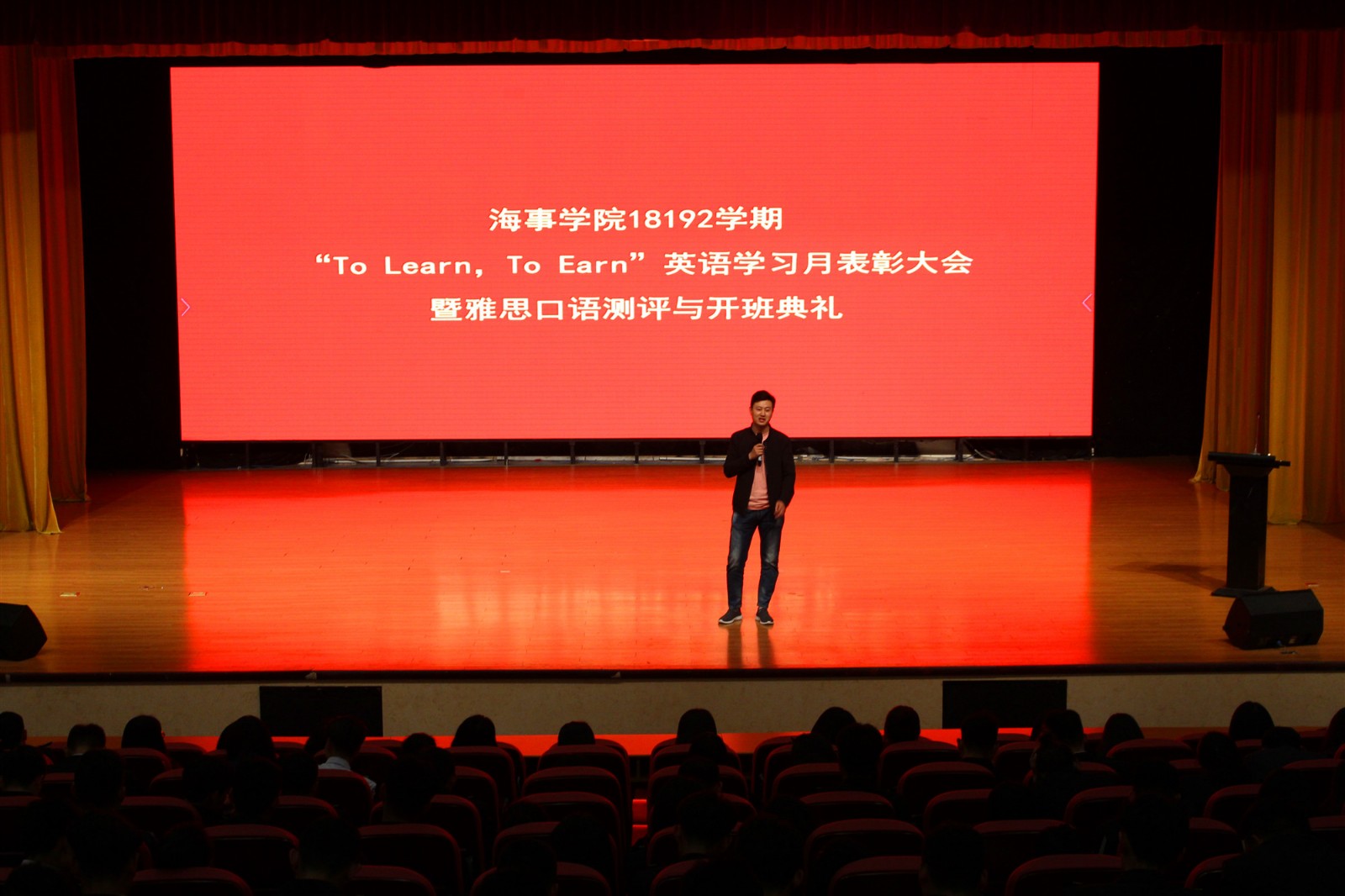 5月14日下午,海事学院18级全体学生在A0报告厅召开”To Learn, To Earn”(学有所获)英语学习月表彰大会暨雅思口语测评与开班典礼。大会现场,周昕老师为英语学习月活动做总结汇报,播放了优秀学生学习成果的视频展。海事学院党支部书记刘子高、副院长刘宪珍和院长助理聂涛出席会议,并为获得一、二、三等奖的学生颁发证书。随后,青岛智美教育的邱一晨老师做了题为“我们的征途是星辰大海”的英语学习讲座,现场的互动交流极大的激发了学生的英语学习热情。最后,聂助理做总结发言,希望学生们学习英语不要等不要怕,在兴趣的指引下逐步积累。会后,青岛智美教育的老师们为学生做了英语水平评估,并提出学习建议。