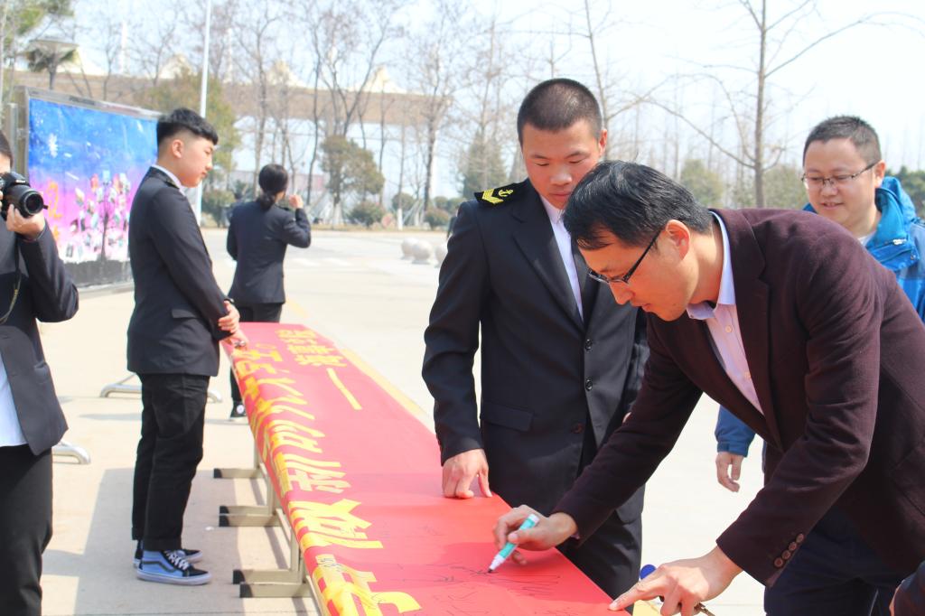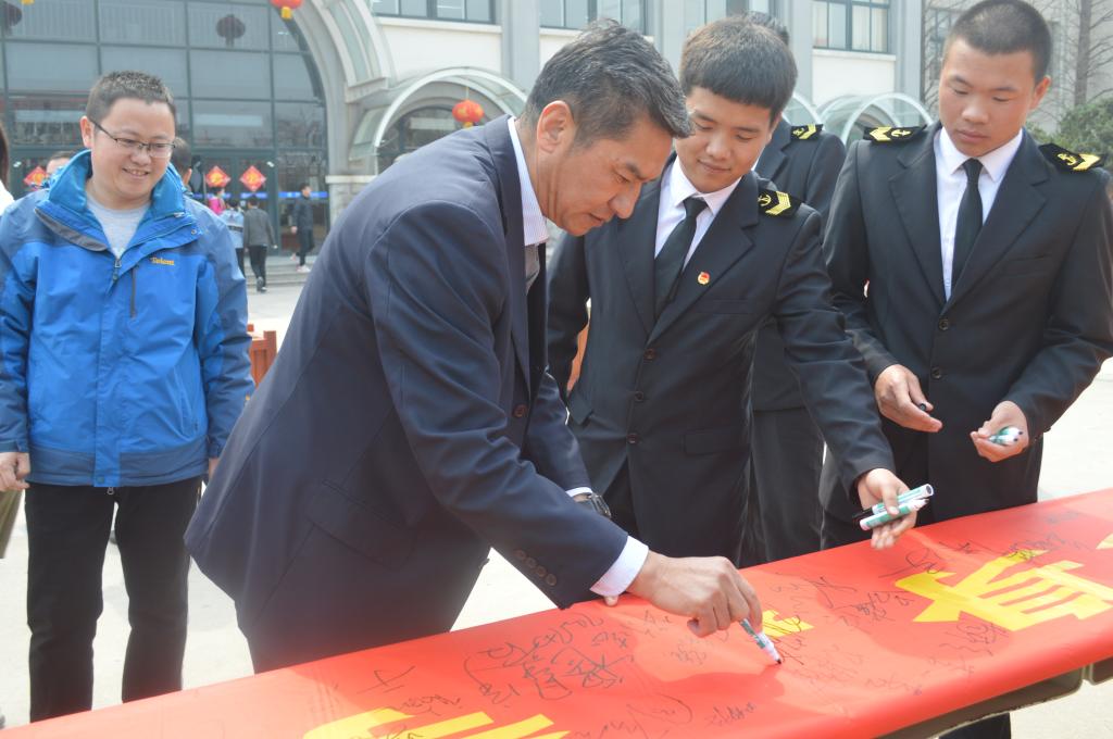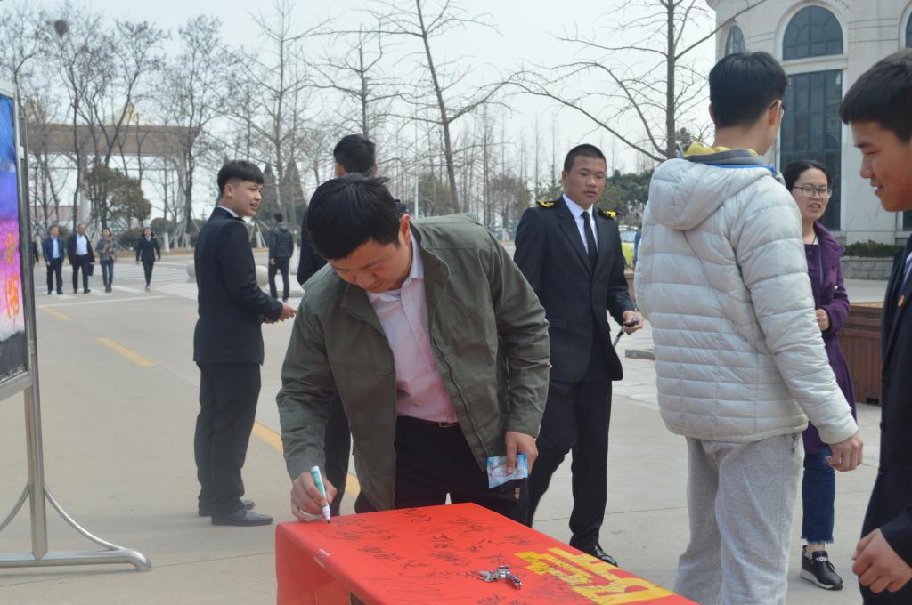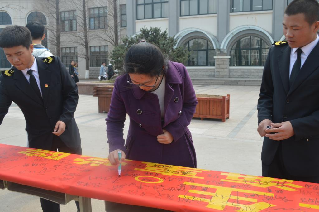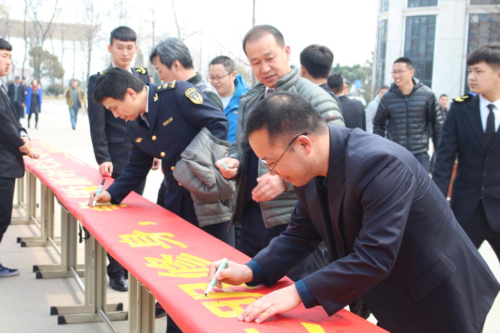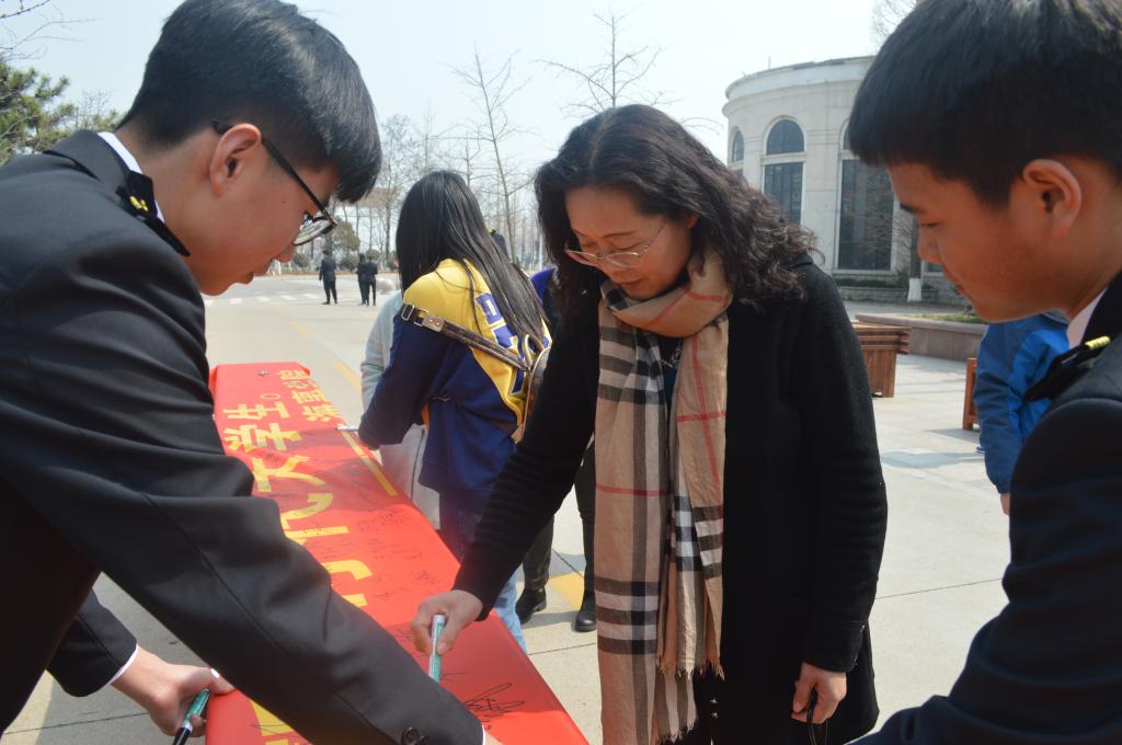 活动开始,学生干部积极向周围的同学介绍此次活动的意义,来校评估的海事局领导、校领导以及各学院领导、老师纷纷加入签名活动,同学们也积极踊跃地在横幅上签下自己的名字。