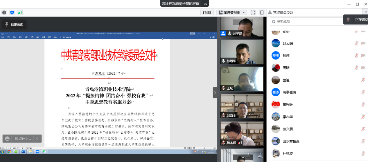 大会由海事学院院长孙增华主持,通过腾讯会议进行主题思想教育动员部署,将主题思想教育实施方案传达到每一名教职员工,做到人人皆知,全员学习。会上,党总支副书记刘子高对方案进行逐字逐句的传达和深刻的解读。孙增华传达了学院党委书记王淑敏和院长杨巨广的讲话精神,要求以各教研室、办公室为单位,在全员学习的基础上进行小组学习讨论,做好吸收内化和自我总结,不断提炼反思,自觉充分的把自己的思想和行动统一到学校党委部署上,为强校建设作出贡献。