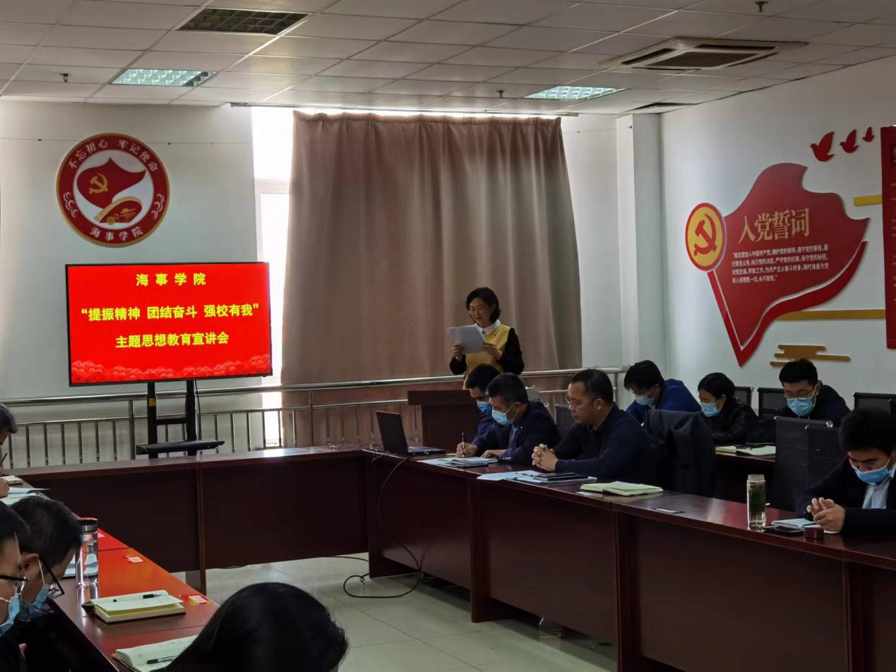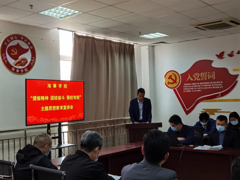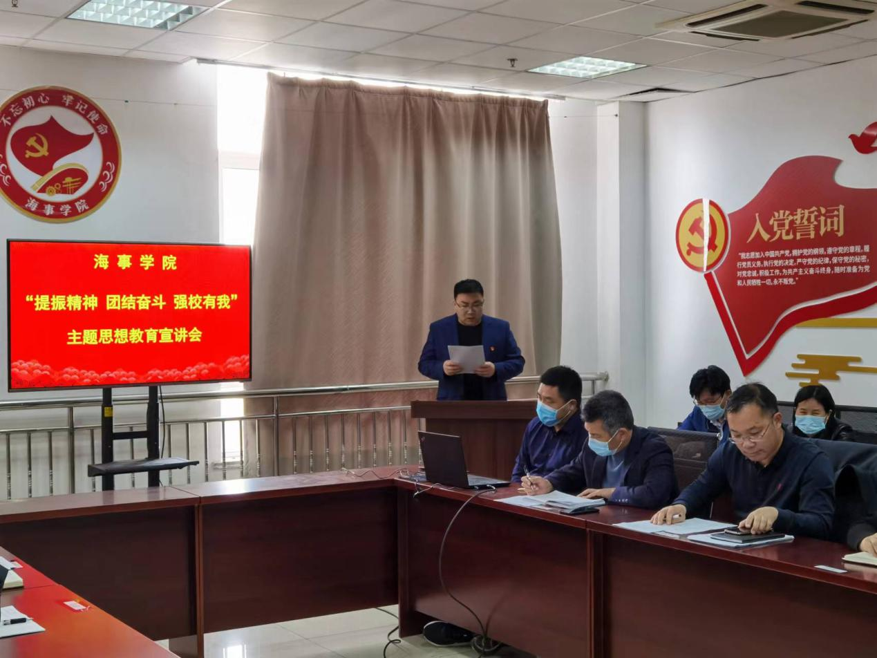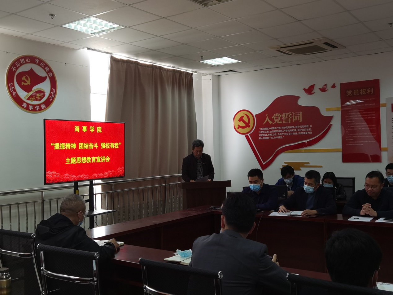 4月26日下午,海事学院召开 “提振精神 团结奋斗 强校有我”主题思想教育宣讲会暨“师德师风教育”专题学习,会议由海事学院党总支副书记刘子高主持。
