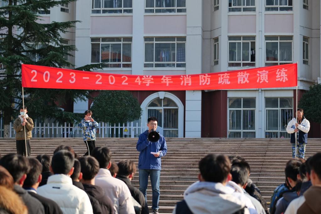 一阵急促的警报声拉开了“消防疏散演练”活动的帷幕。听到警报声,各位老师到达指定位置,同学们用毛巾捂住口鼻,弯着腰,沿着演练指定楼梯口快速前进,有序地撤离到安全地带;在演练中,同学们能够做到遇到紧急情况沉着冷静。集结完毕后,高延年对消防疏散演练进行了总结,指出了演练过程中存在的问题,同时从清晰疏散通道、知晓消防设施位置,自觉维护疏散通道畅通、爱护消防设施;加大对大功率电器、私拉乱接电器线路、存放易燃易爆品的督查;离开宿舍人走电断、不在校园内吸烟、不携带火种三点希望。