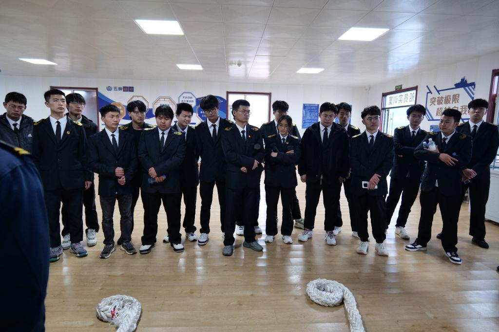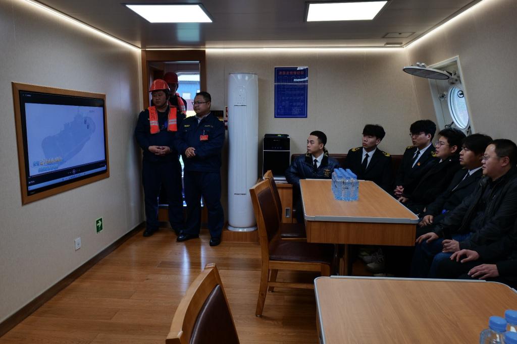 在工作人员的带领下,学生们登轮参观“青港拖1”,船长张自晓对轮甲板、仪器使用以及五个文明管理做了全面详细的讲解,轮机长刘强讲述了机舱设备的管理和保养,学生们切身体验,对拖轮有了进一步的认识和了解。随后,学生们参观实训基地,观看水手业务绝活展演、救生设备使用展示、航海助航仪器使用等,众多业务绝活和设备仪器让学生们眼前一亮。在镰湾河基地职工之家观看的轮驳公司宣传片,使学生们认真了解了镰湾河的发展历史及业务扩展。最后,优秀校友于洋经理与学生分享自身成长经历,学生们也与其交流学习感受。