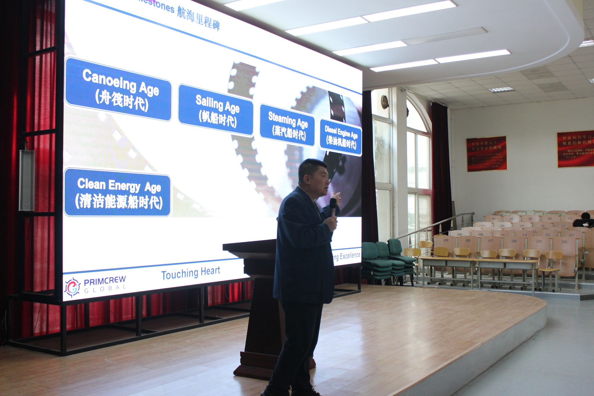 尹国杰以深厚的行业积淀,带领同学们回溯航海文明的演进脉络:从舟筏时代的原始探索,到帆船、蒸汽船、柴油机船时代的技术飞跃,再到清洁能源船时代的绿色转型,清晰勾勒出航海技术的发展轨迹,让大家直观领略航海事业的沧桑巨变与航海人开拓进取的精神内核。在职业规划环节,他结合自身从业经历,系统解读航海职业体系与晋升路径,分析航运业全球化机遇与智能船舶、绿色航运等新趋势,鼓励同学们锤炼专业本领、提前规划,以适应行业发展需求。