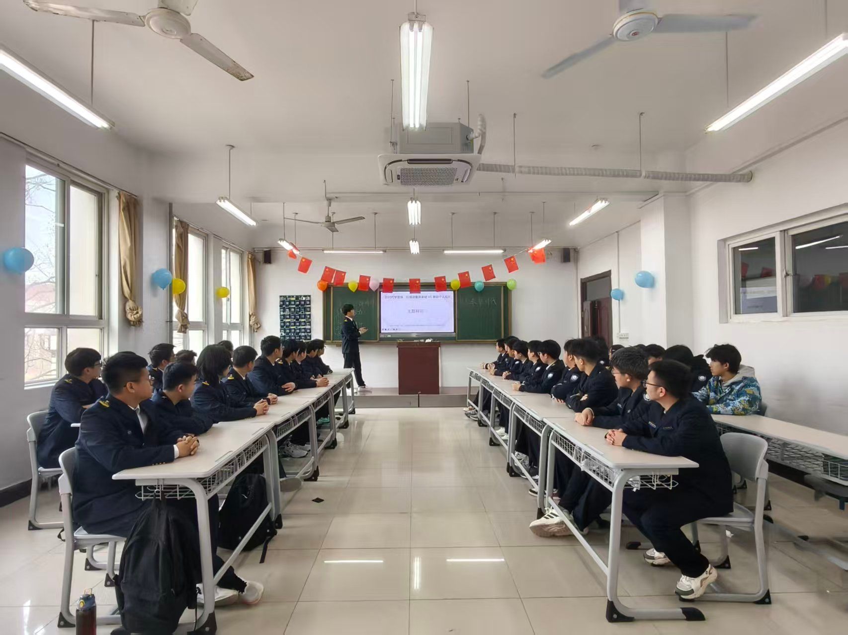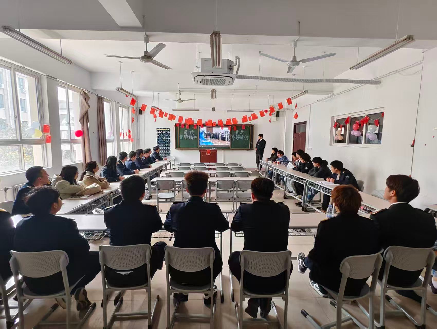 团课上,各班集中观看《走进雷锋》等事迹纪录片及相关视频片段,雷锋从普通士兵到时代楷模的成长历程,以及他“为人民服务”的崇高境界,让同学们深受触动,观影现场井然有序。观影后,各班围绕“雷锋精神与航海人的使命担当”展开交流,同学们结合专业特点畅谈感悟,将雷锋的敬业精神、螺丝钉精神与航海岗位责任相联结。部分班级还设置“我身边的雷锋”分享环节,班委助学、同学顶岗奉献等鲜活故事,让雷锋精神落地生根。