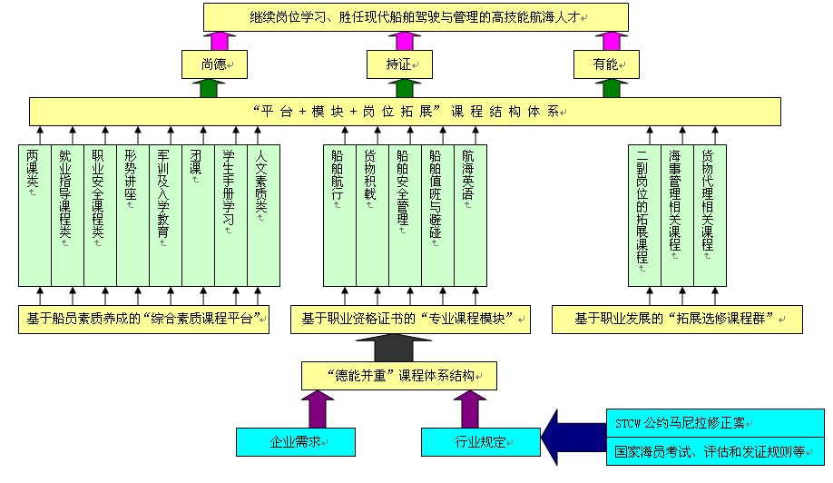 “德能并重”课程体系紧紧围绕培养目标,由基于船员素质养成的“综合素质课程平台”、基于职业资格证书的“专业课程模块”和基于职业发展的“拓展选修课程群”组成。