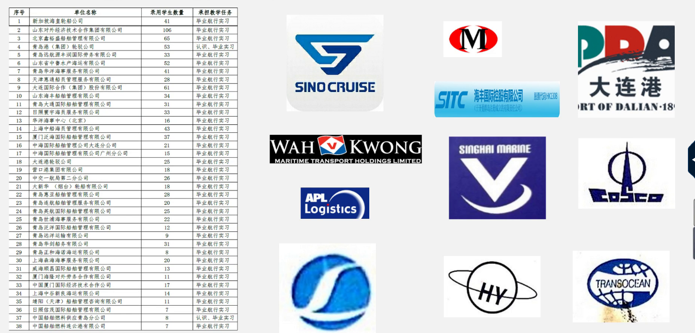 目前已与中国远洋海运集团有限公司、招商局集团有限公司、山东对外经济技术合作集团有限公司、青岛洲际之星船务有限公司、北京鑫裕盛船舶管理有限公司、大连国际合作(集团)股份有限公司、日照寰宇海员服务有限公司、青岛港(集团)轮驳公司等65家国内外知名航运公司开展就业合作。