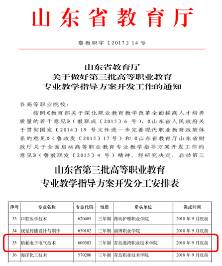 船舶电子电气技术专业于2017年获批山东省第三批高等职业教育专业教学指导方案的开发工作。