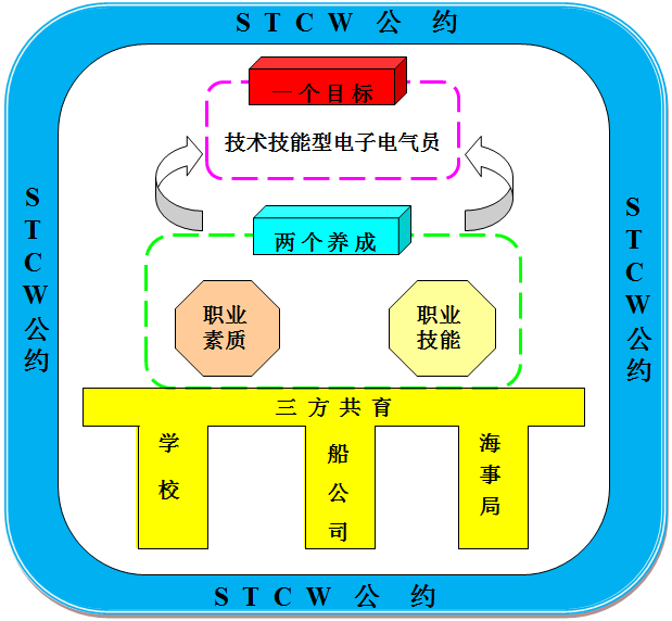 船舶电子电气技术专业实施以满足国际海事组织STCW公约适任要求为标准,培养国际化技术技能型船舶电子电气员为核心,着力职业素质和职业技能养成为途径,由学校、船公司、海事局三方共育为保障的人才培养模式。